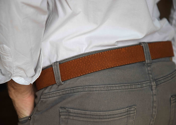 Cinturón «Liso de Carpincho», con hebilla en bronce viejo y pasador bordado.