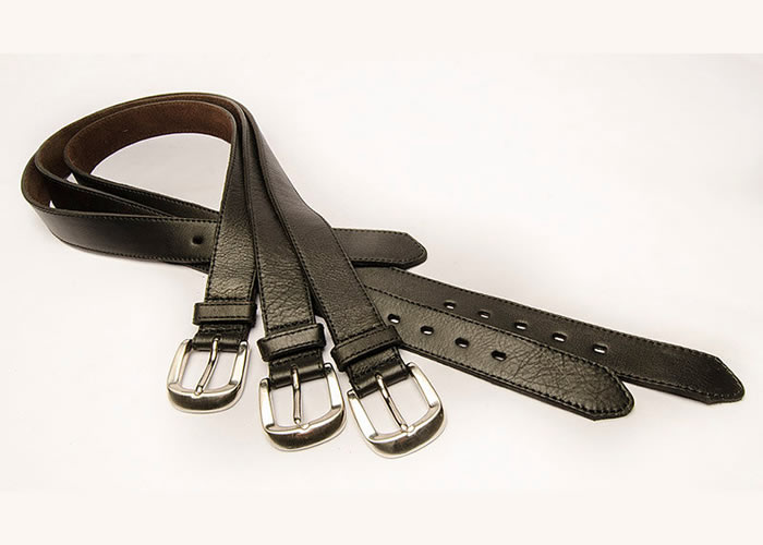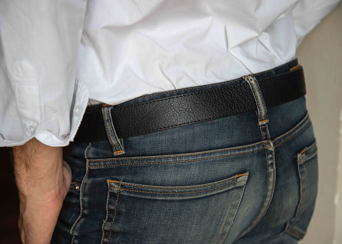 Cinturón «Liso Negro», con gamuza en su parte posterior y hebilla en bronce viejo.