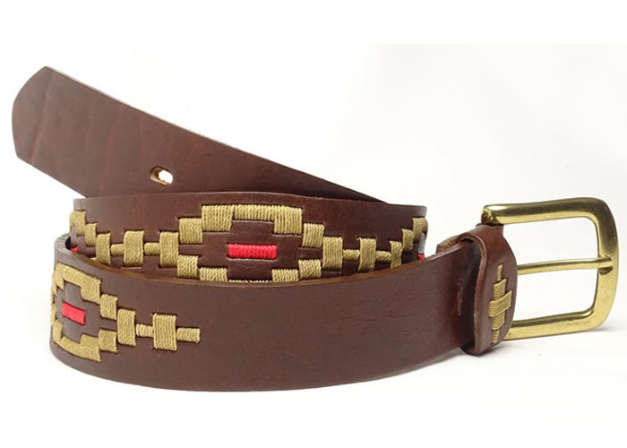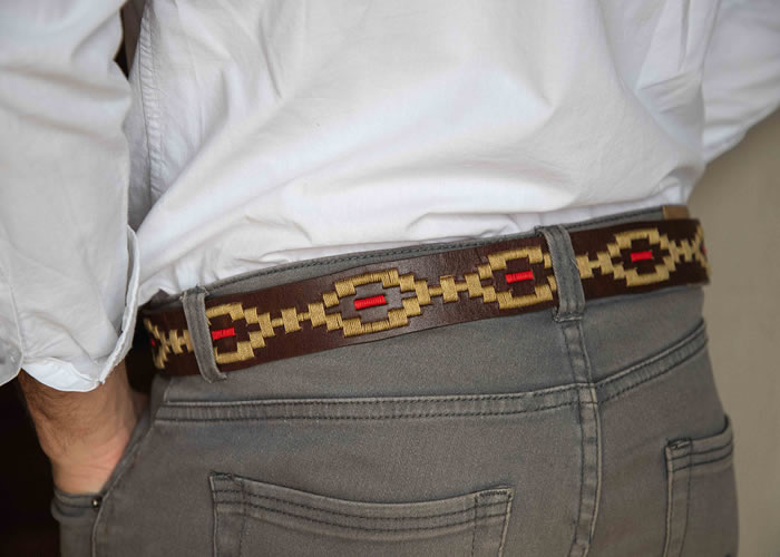 Cinturón » Rombos Café», con hebilla en bronce viejo y pasador bordado, con distintas combinaciones de hilos.