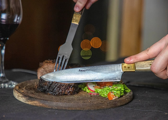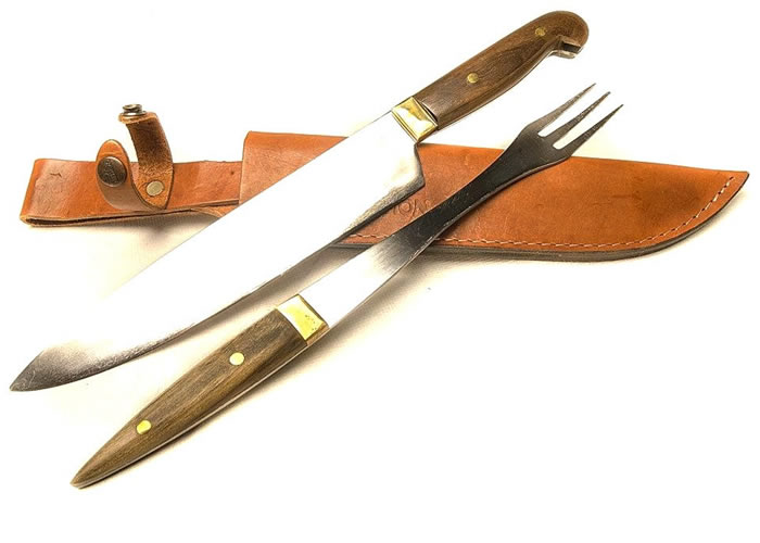 Juego de cuchillo y tenedor Gigante de acero inoxidable con mango de madera.