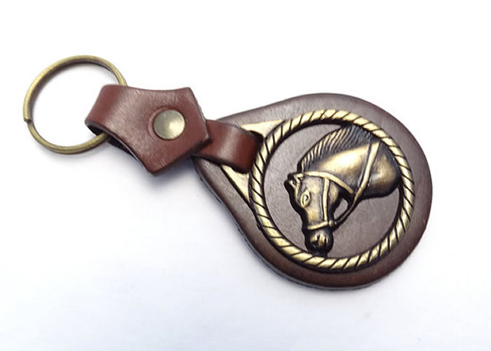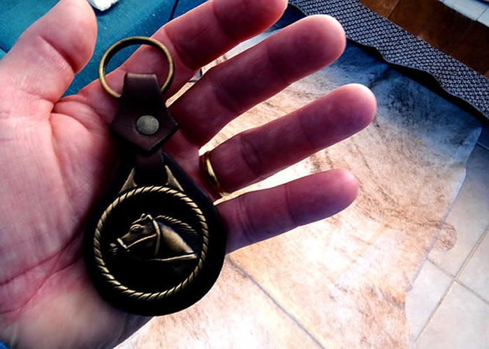 Llavero , «Cuero con Medalla», elaborado con cuero de pelo y suela en su parte posterior.