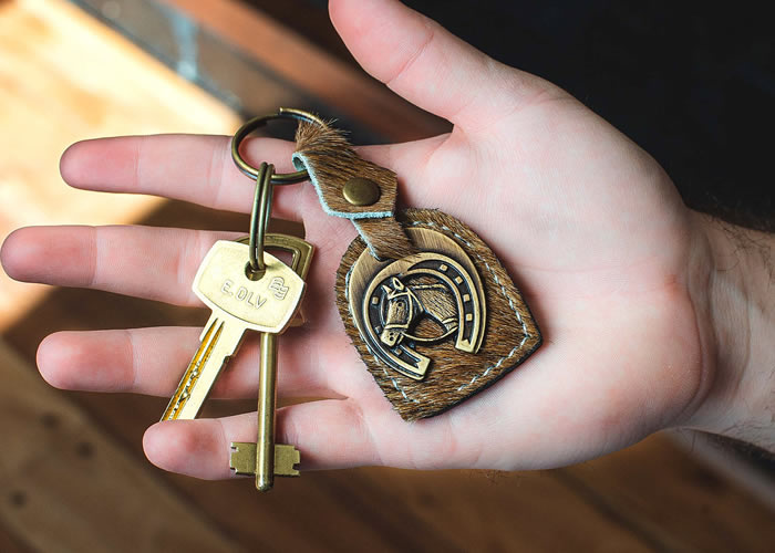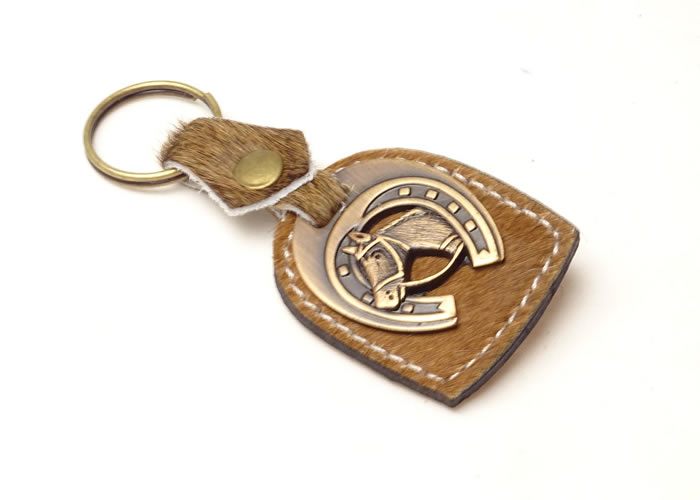 Llavero , «Pelo con Medalla», elaborado con cuero de pelo y suela en su parte posterior.