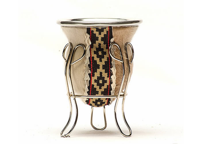Mate de » Vidrio con pie de Alambre» «,cuero o pelo con Guarda Pampa forrado en cueros variados y con costura en tiento.
